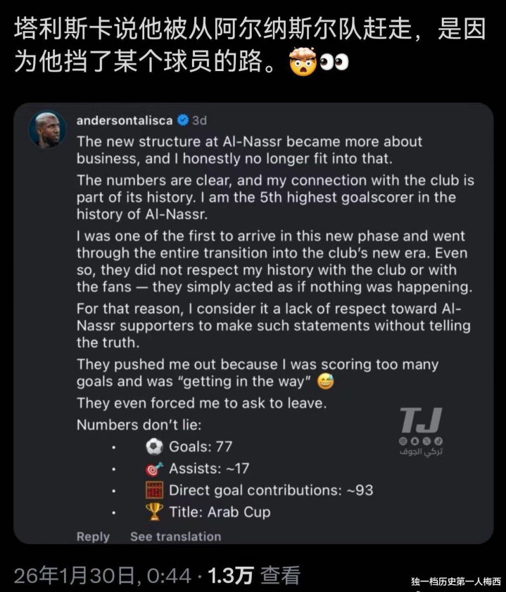 塔利斯卡表示,利雅得胜利已经转型了,更倾向于商业,(喜欢踢球的)自己确实不适合留在那里。但数据摆在那里,自己就是俱乐部队史的一部分,他是最早加入利雅得胜利、并且进球队史前五的名宿,经历了俱乐部的过渡。可老东家管理层既不尊重自己的底蕴,也不尊重他跟球迷的情感,只会睁眼瞎。