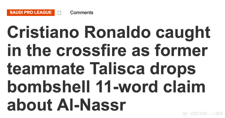 著名媒体World Soccer Talk报道了这件事,并且标题就点名C罗,文章叫《Cristiano Ronaldo caught in the crossfire as former teammate Talisca drops bombshell 11-word claim about Al-Nassr》(《C罗身陷漩涡,前队友塔利斯卡关于利雅得胜利抛出11字重磅言论》)。
